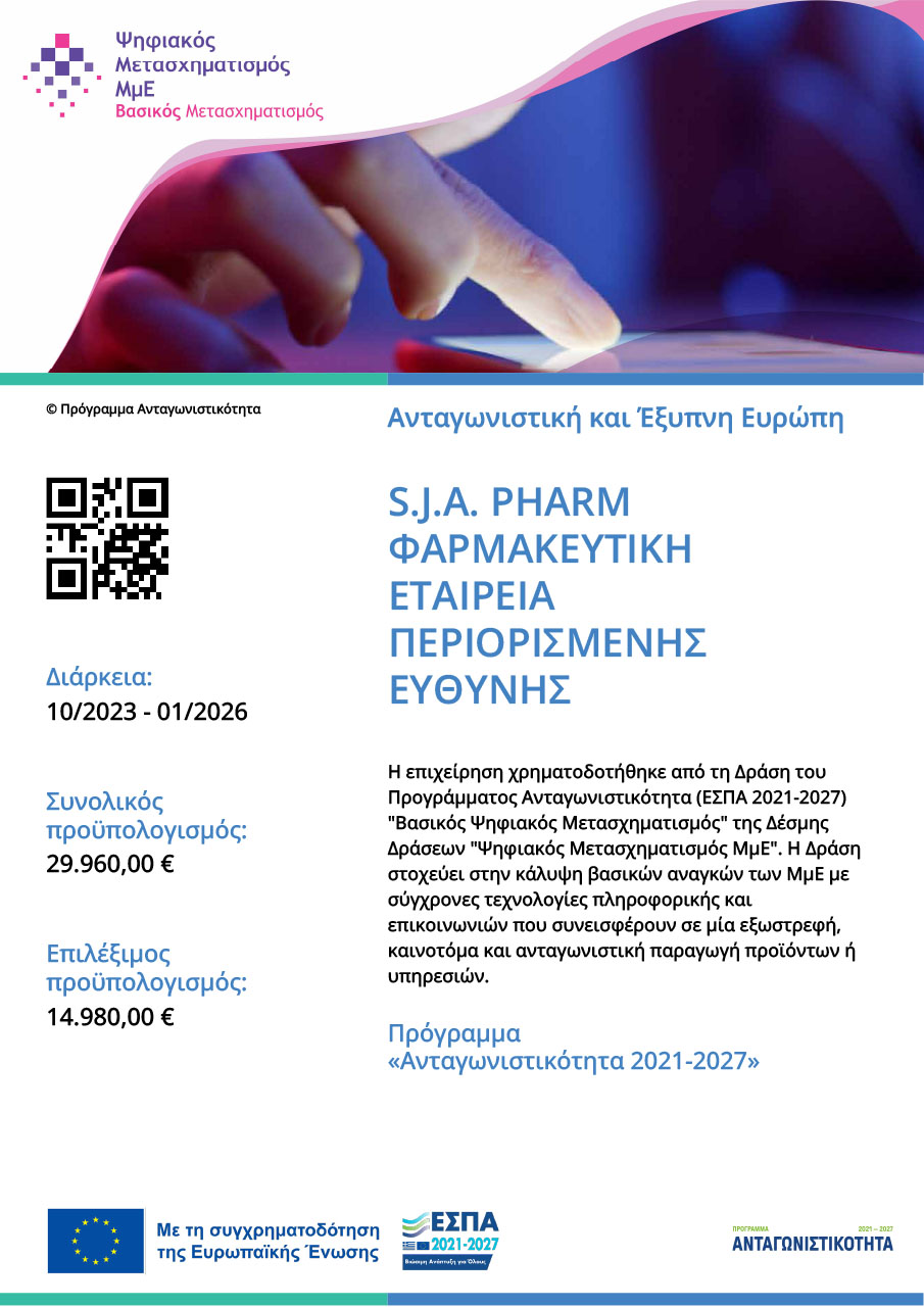 Η επιχείρηση χρηματοδοτήθηκε από τη Δράση του Προγράμματος Ανταγωνιστικότητα (ΕΣΠΑ 2021-2027) «Βασικός Ψηφιακός Μετασχηματισμός» της Δέσμης Δράσεων «Ψηφιακός Μετασχηματισμός ΜμΕ». Η Δράση στοχεύει στην κάλυψη βασικών αναγκών των ΜμΕ με σύγχρονες τεχνολογίες πληροφορικής και επικοινωνιών που συνεισφέρουν σε μία εξωστρεφή, καινοτόμα και ανταγωνιστική παραγωγή προϊόντων ή υπηρεσιών.